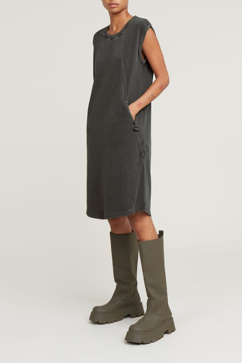 La robe Seam Detail présente des manches courtes retroussées attachées par une bande tissée. Des poches ont été ajoutées au niveau des coutures en biais du devant. Cette robe présente une longueur aux genoux.