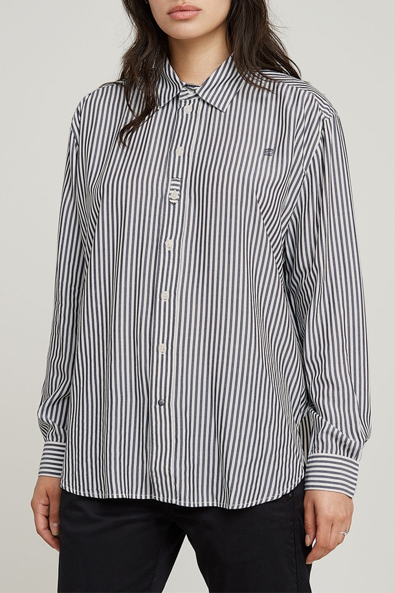 La chemise Boyfriend affiche une coupe ample et présente une base arrondie. Le pli pris sous l’empiècement à l'épaule complète le look. La languette sur la fermeture du bouton ajoute un détail distinctif.