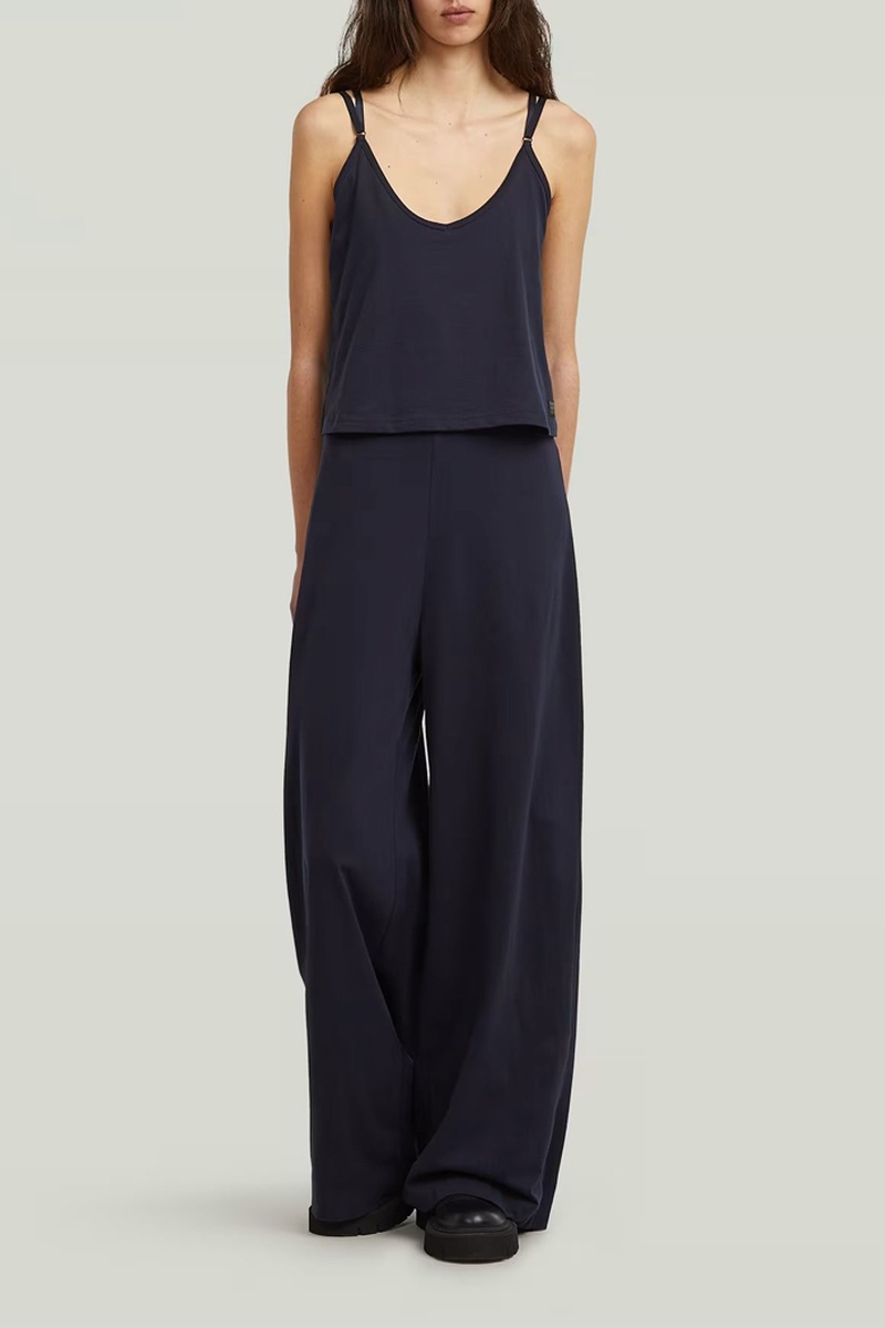 La Combinaison Spaghetti Strap est proposée dans une coupe droite présentant une jambe large. Le top est fixé uniquement sur les côtés de la ceinture pour créer un effet ample.