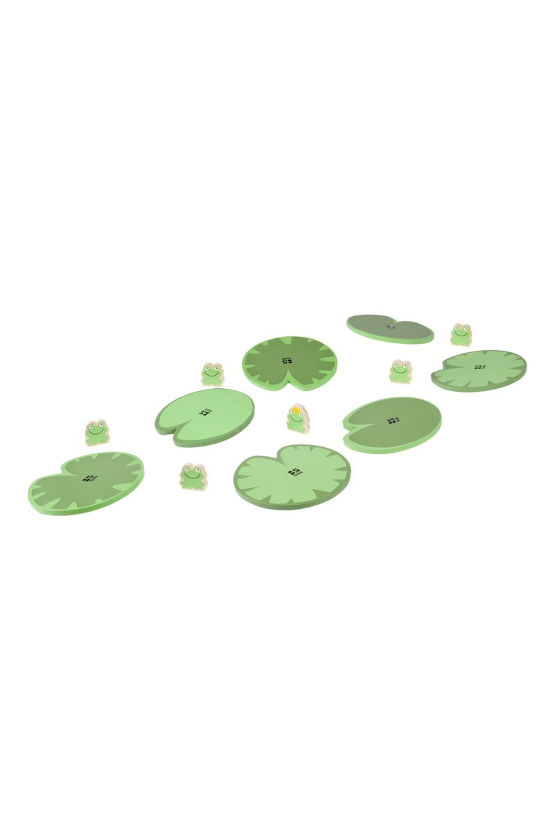 Règles du jeu : l'enfant traverse un parcours composé de nénuphars bancals et ramasse des grenouilles sur le chemin.