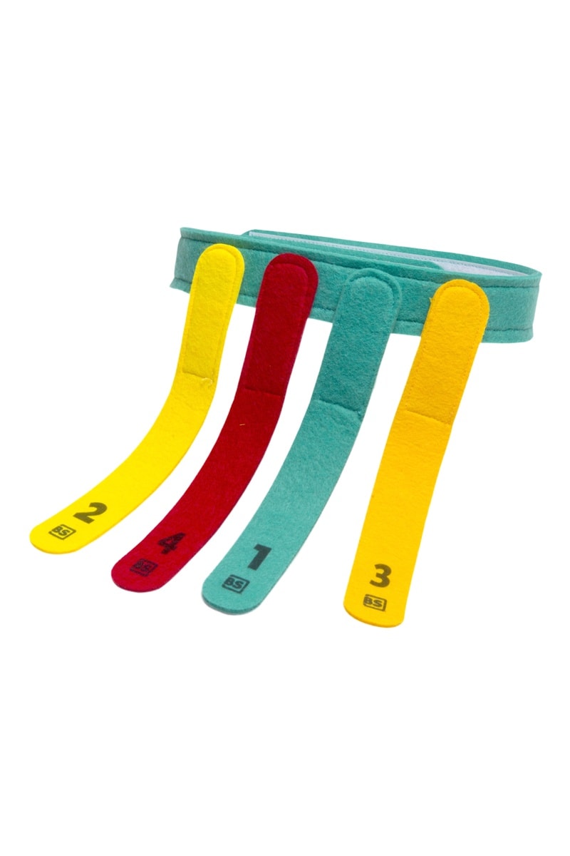 Règles du jeu : chaque joueur commence avec quatre queues colorées attachées à une ceinture en velcro.