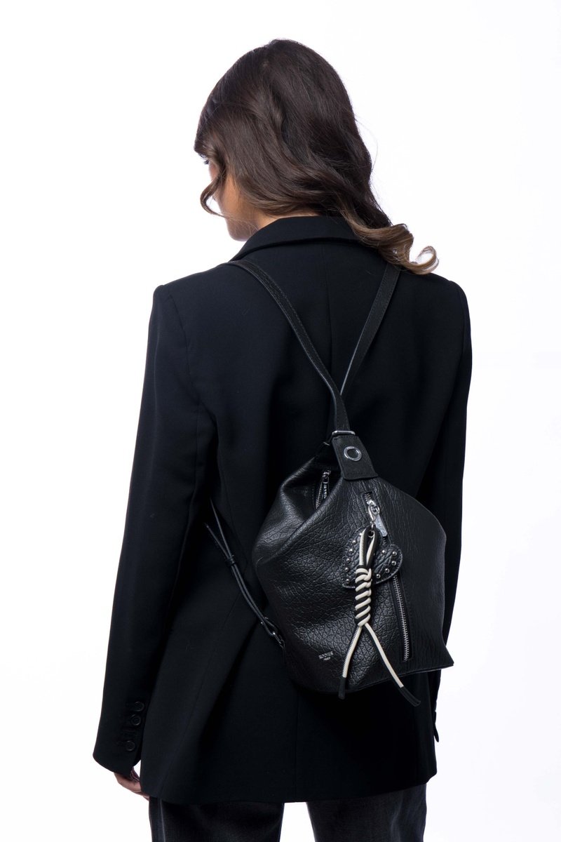 Sac à dos en cuir grainé transformable en sac porté épaule.