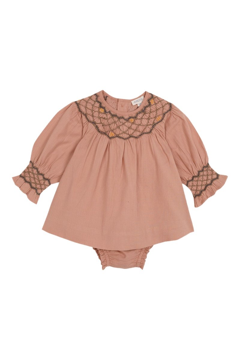 Motifs fantaisie brodés et smocks à l’encolure et sur les manches.