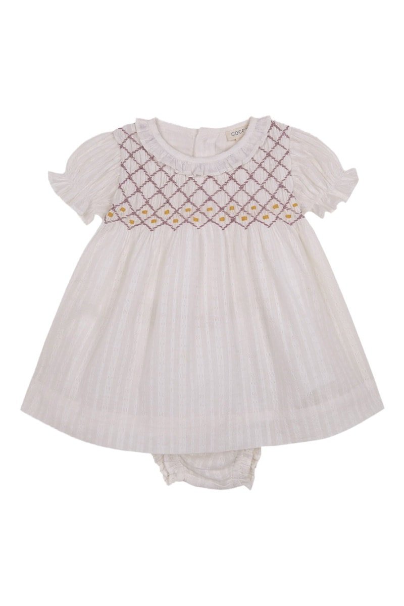 Motifs fantaisie brodés et smocks devant.