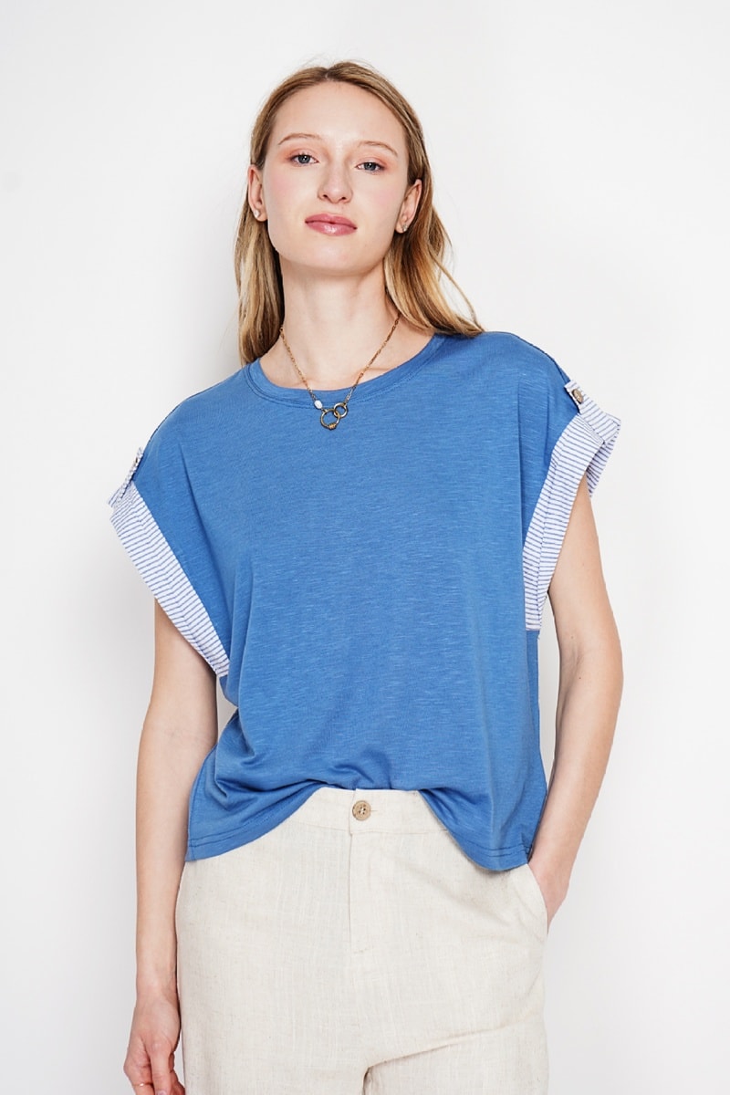 Manches courtes avec patte boutonnée et empiècement à motifs à rayures.
