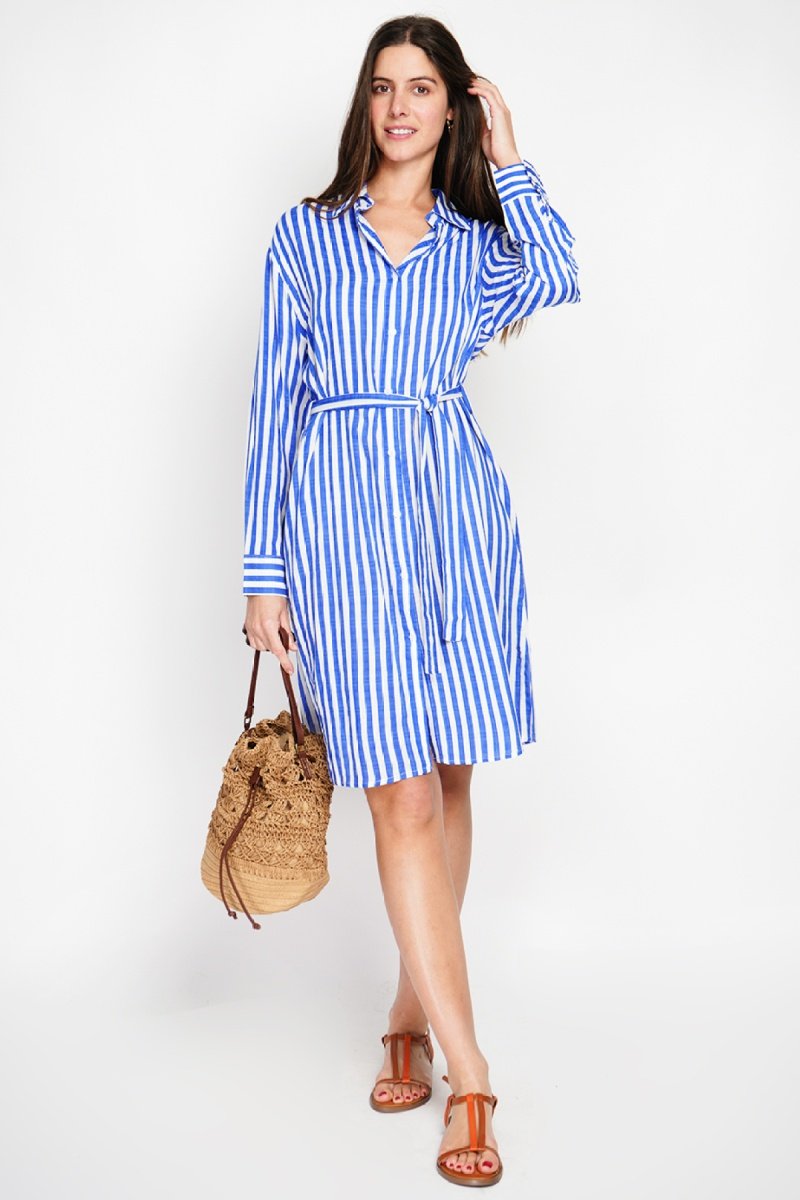 Robe chemise en lin et soie - Blanc et bleu