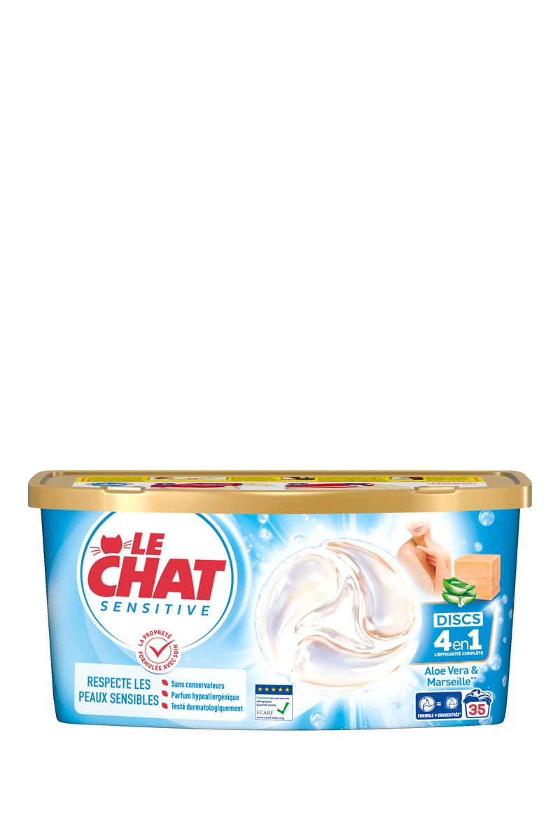 Le Chat Discs Sensitive Savon de Marseille & Aloe Vera, la capsule 4-en-1 qui vous garantit un linge propre tout en respectant les peaux sensibles, grâce à sa formule développée avec des dermatologues.