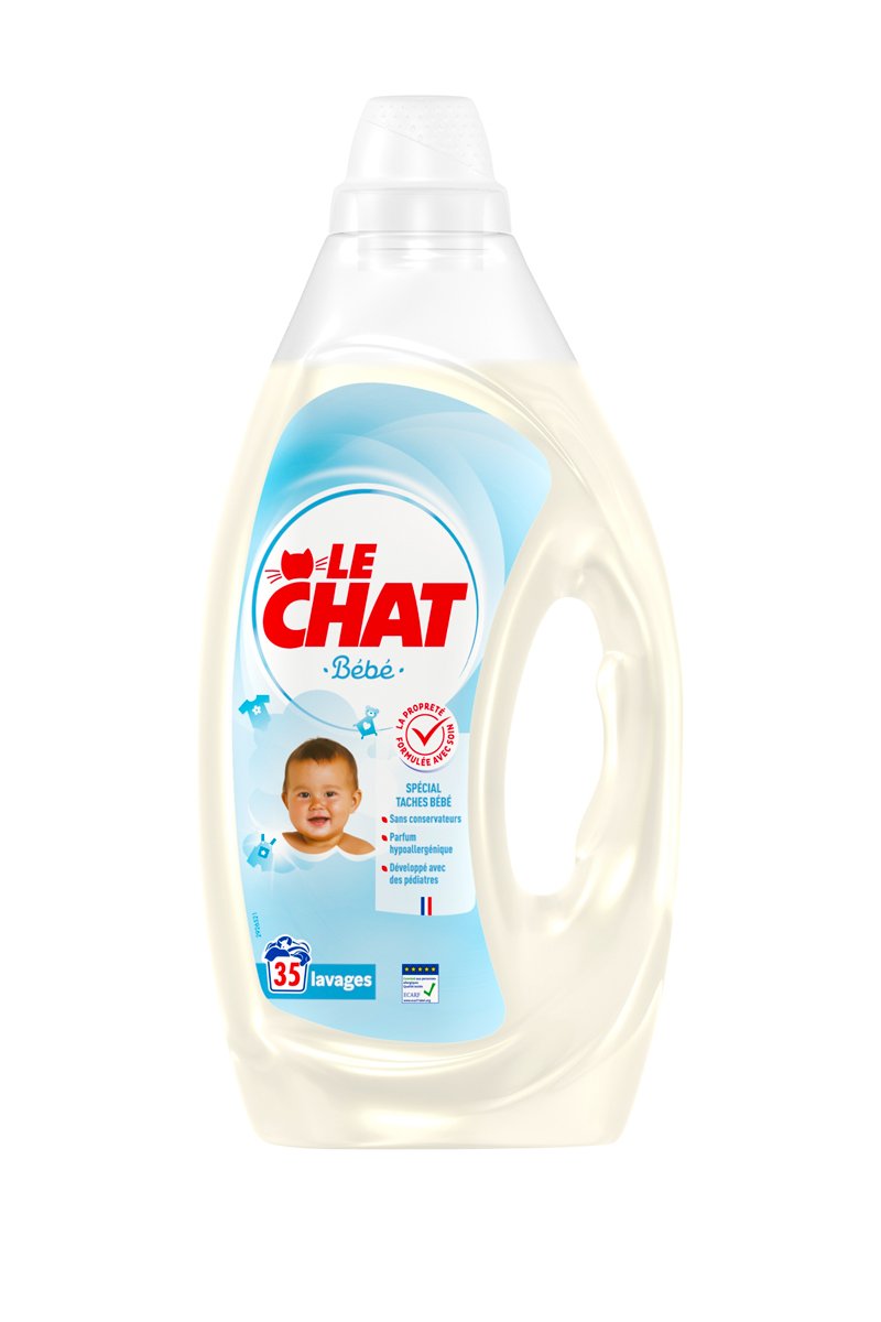 Le Chat Bébé est une lessive spécialement conçue pour venir à bout des tâches de bébé (céréales, carottes, lait, etc), tout en respectant leurs peaux sensibles.