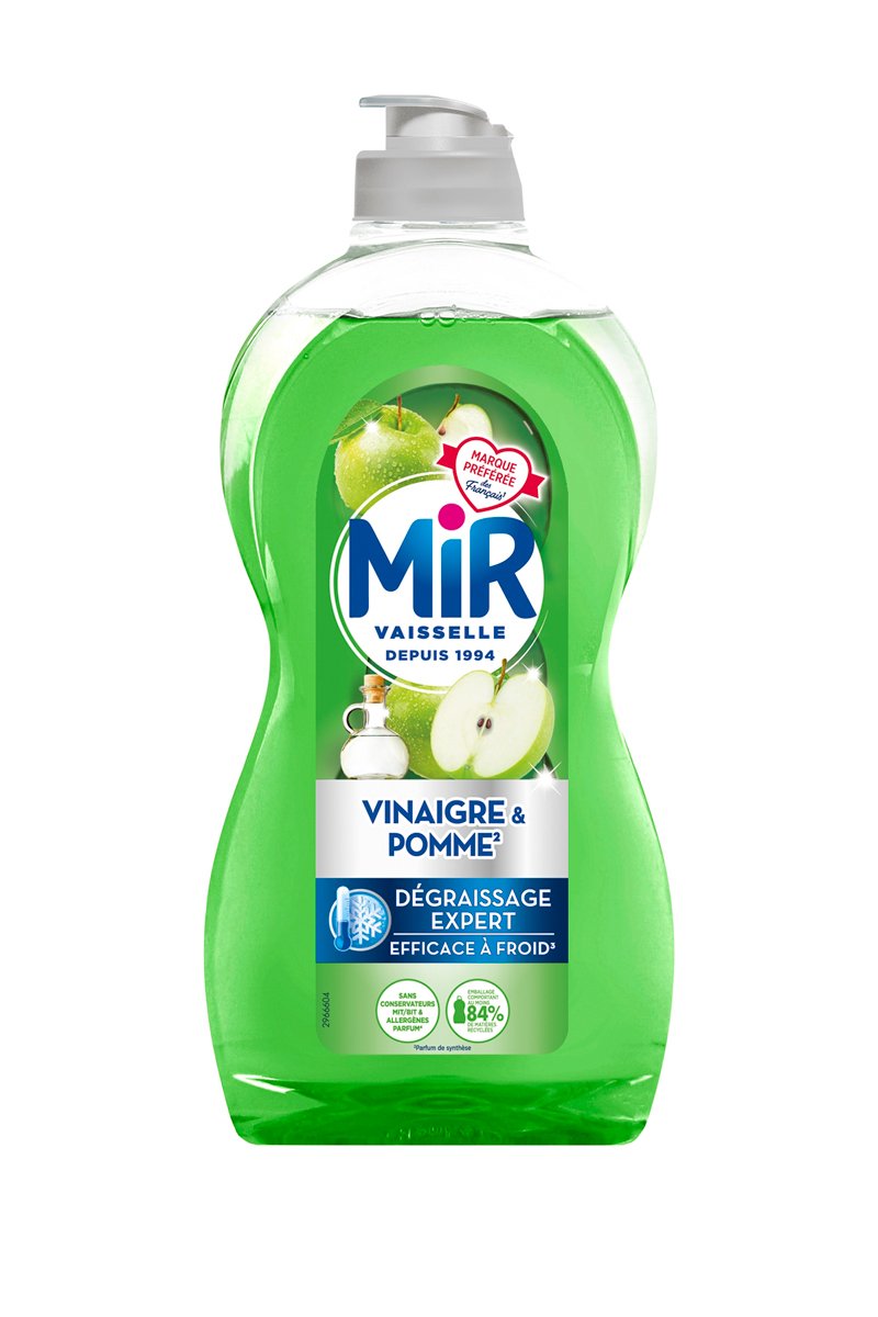 Met en action l'efficacité de Mir, associée aux propriétés dégraissantes du vinaigre blanc et au doux parfum de pomme.