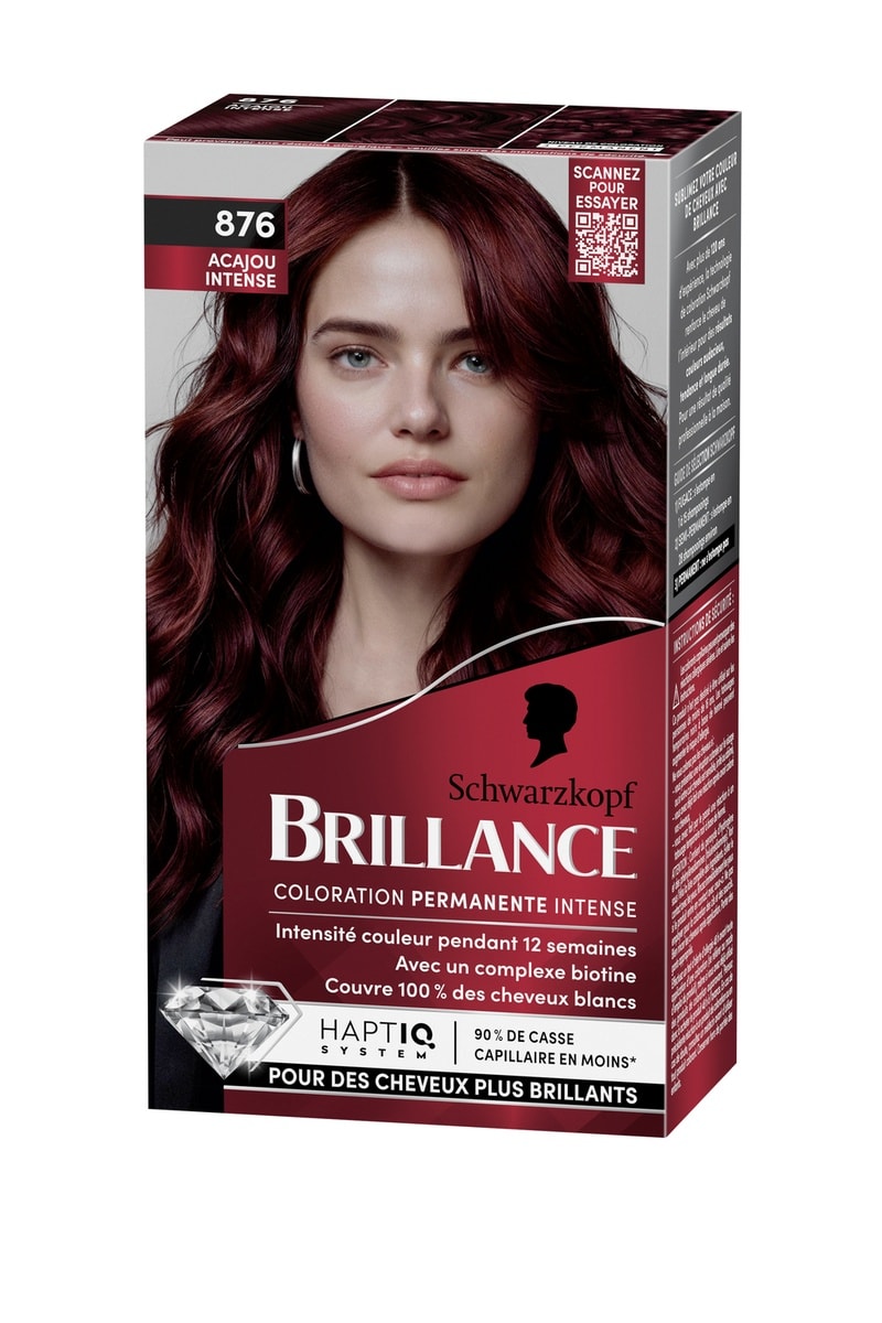 La formule haute performance de cette coloration Brillance offre une intensité irrésistible jusqu'à 12 semaines et une couverture à 100 % des cheveux blancs.
