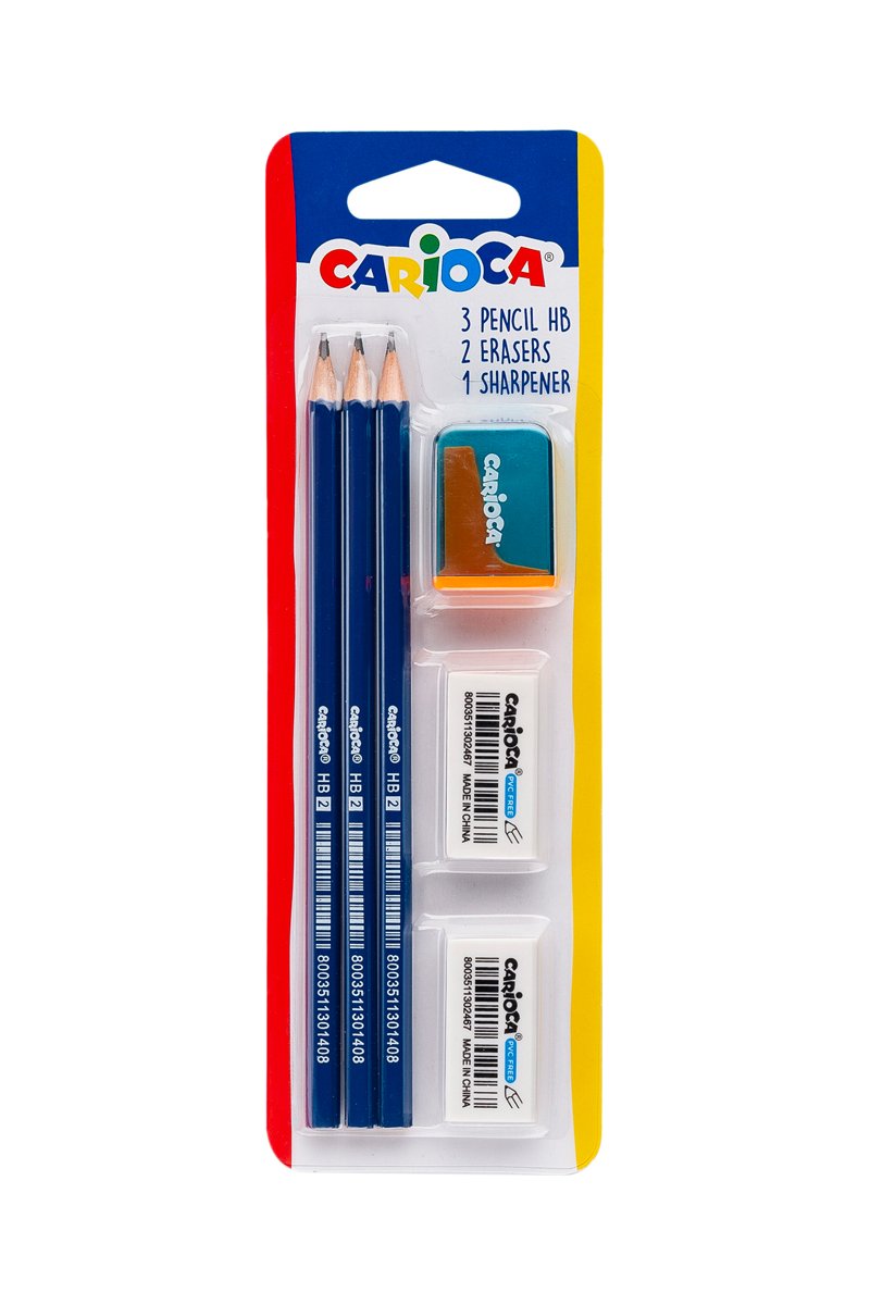 3 crayons à papier HB, 2 gommes et 1 taille crayon.