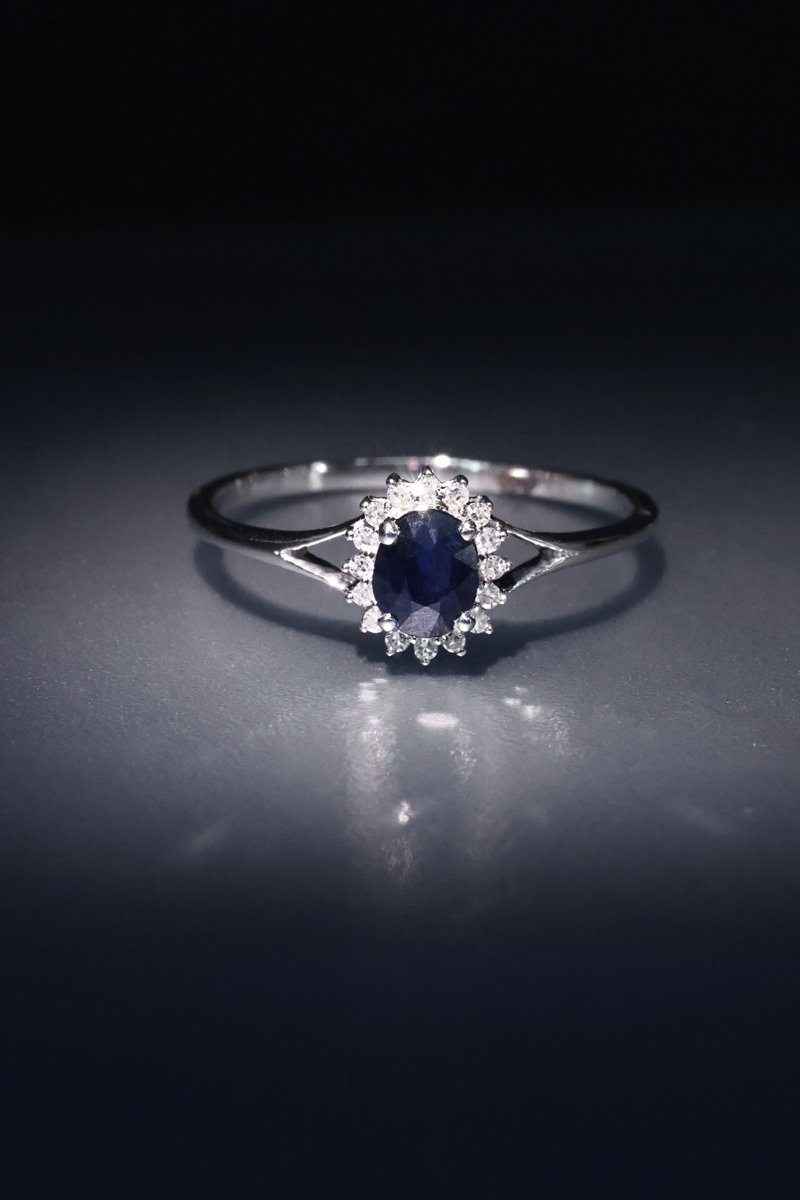 Matière : or blanc 375/1000, diamants 0,06 carat/16 et saphir 0,25 carat/1