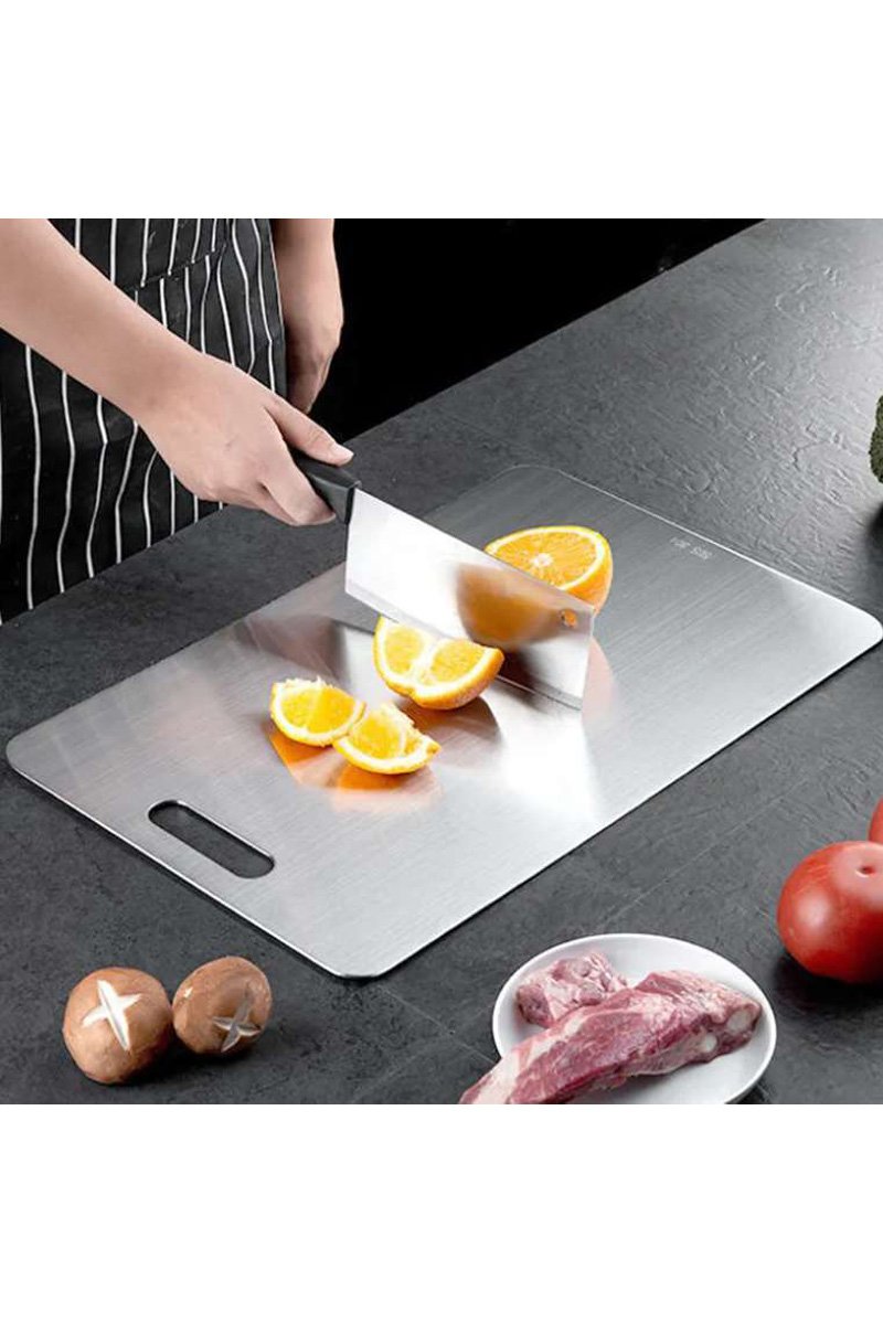Planche à découper en acier inoxydable antibactérien.