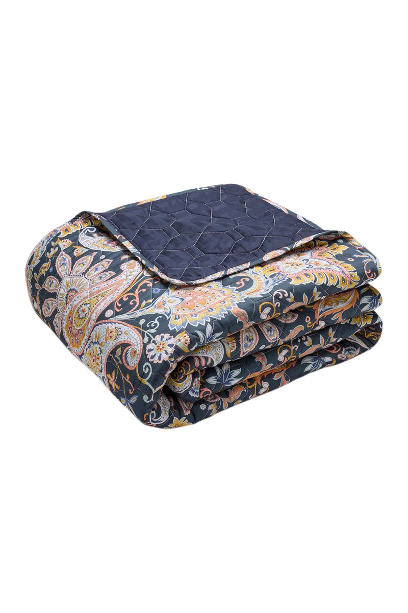 Couvre-lit en satin de coton 80 fils/cm² Paisley - Bleu foncé et jaune