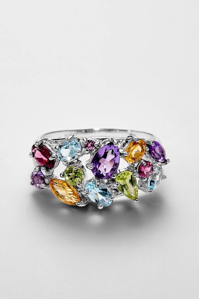 Bague en or blanc sertie de 3 améthystes, de 2 citrines, de 2 rhodolites et de 3 topazes.