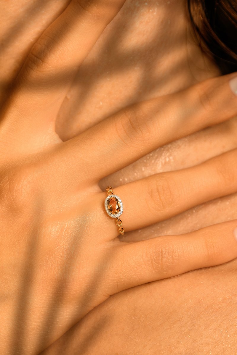 Bague en or jaune sertie de 18 diamants et d’une citrine.