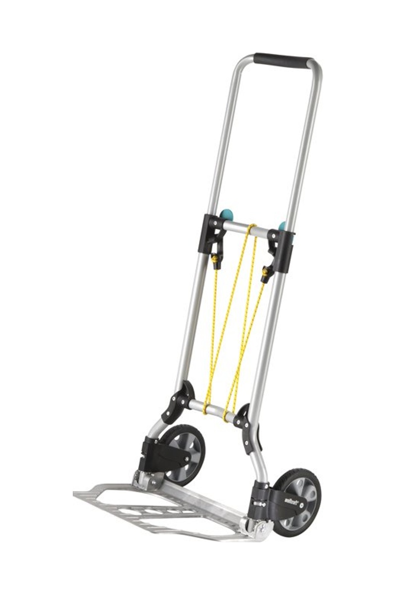 Les roues et le plateau se plient et se déplient en une seule opération. Ainsi, le TS 600 trouve sa place dans tous les véhicules et reste à portée de main lorsque vous faites vos courses.