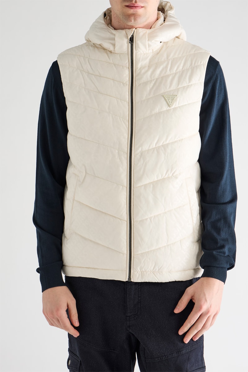 Doudoune à capuche sans manches.