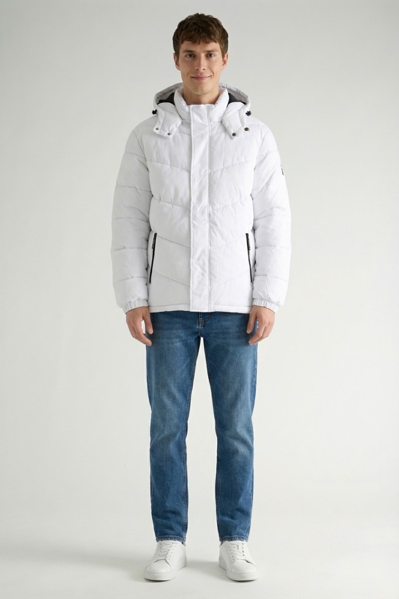 Doudoune à capuche pressionnée avec liens de serrage et barillet.