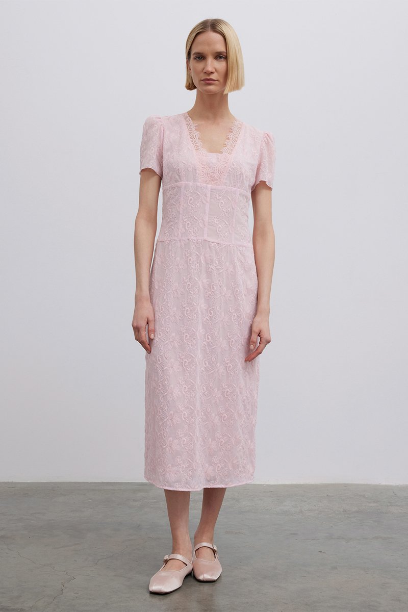 Robe midi en tulle brodée à manches courtes.