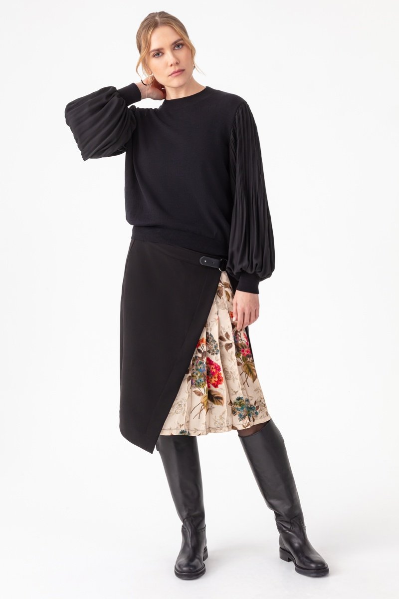 Jupe portefeuille plissée asymétrique - Noir et multicolore
