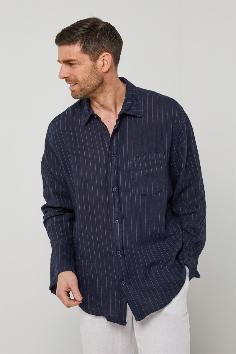 Chemise en lin à manches longues retroussables par patte boutonnée.
