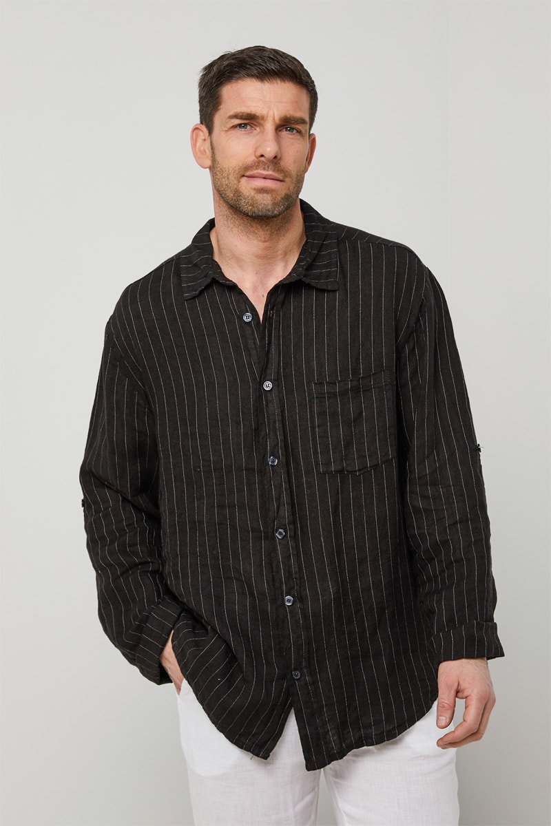 Chemise en lin à manches longues retroussables par patte boutonnée.