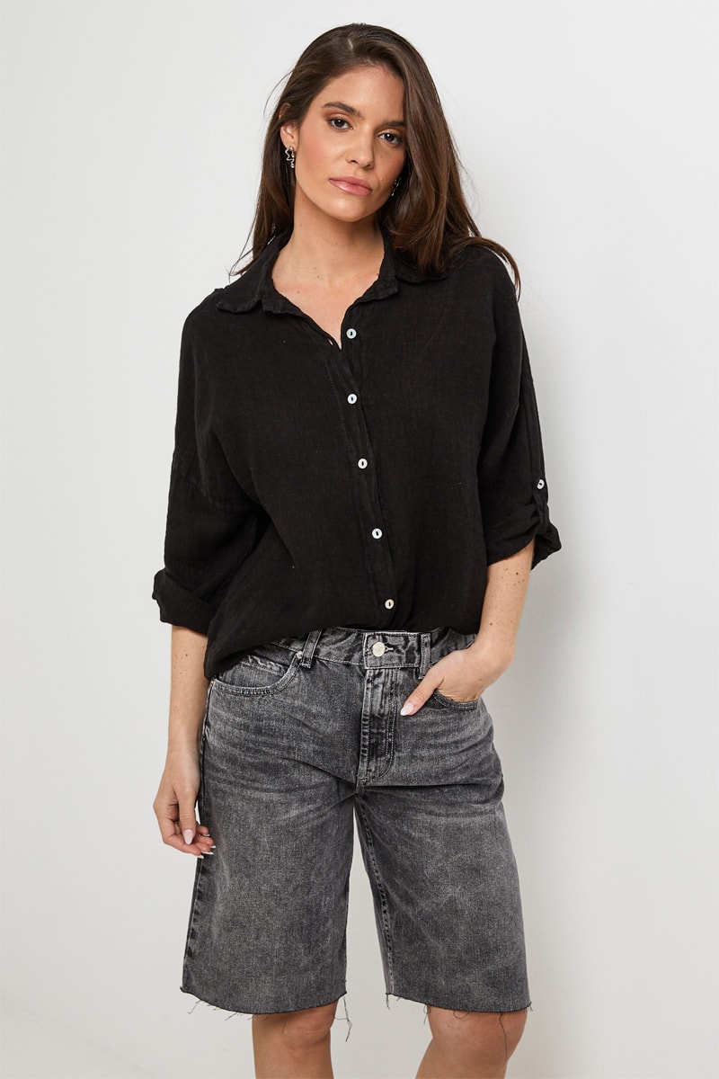Chemisier en lin à manches longues retroussables par patte boutonnée.