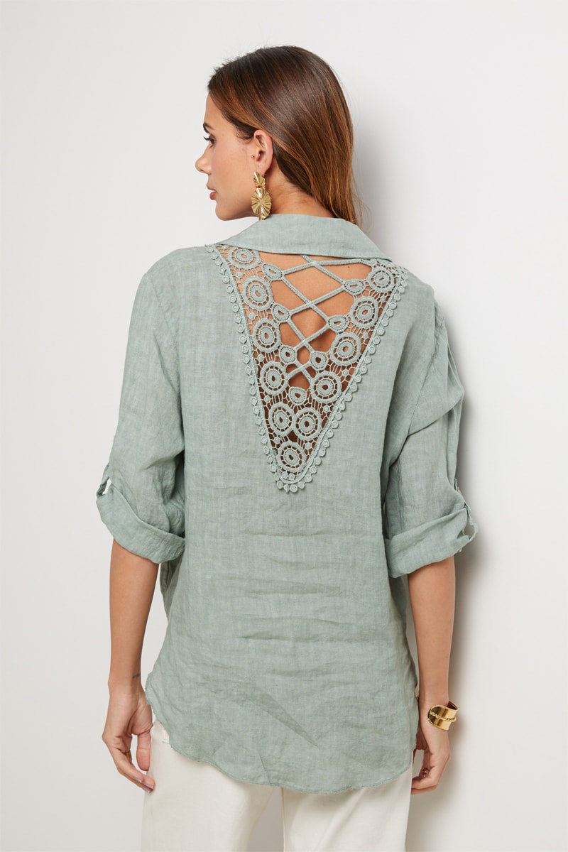 Chemisier en lin à manches longues retroussables par patte boutonnée.