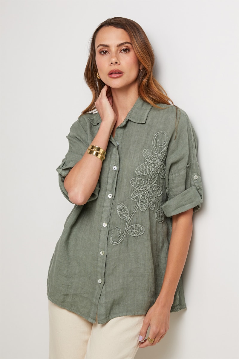 Chemisier en lin à manches longues retroussables par patte boutonnée.