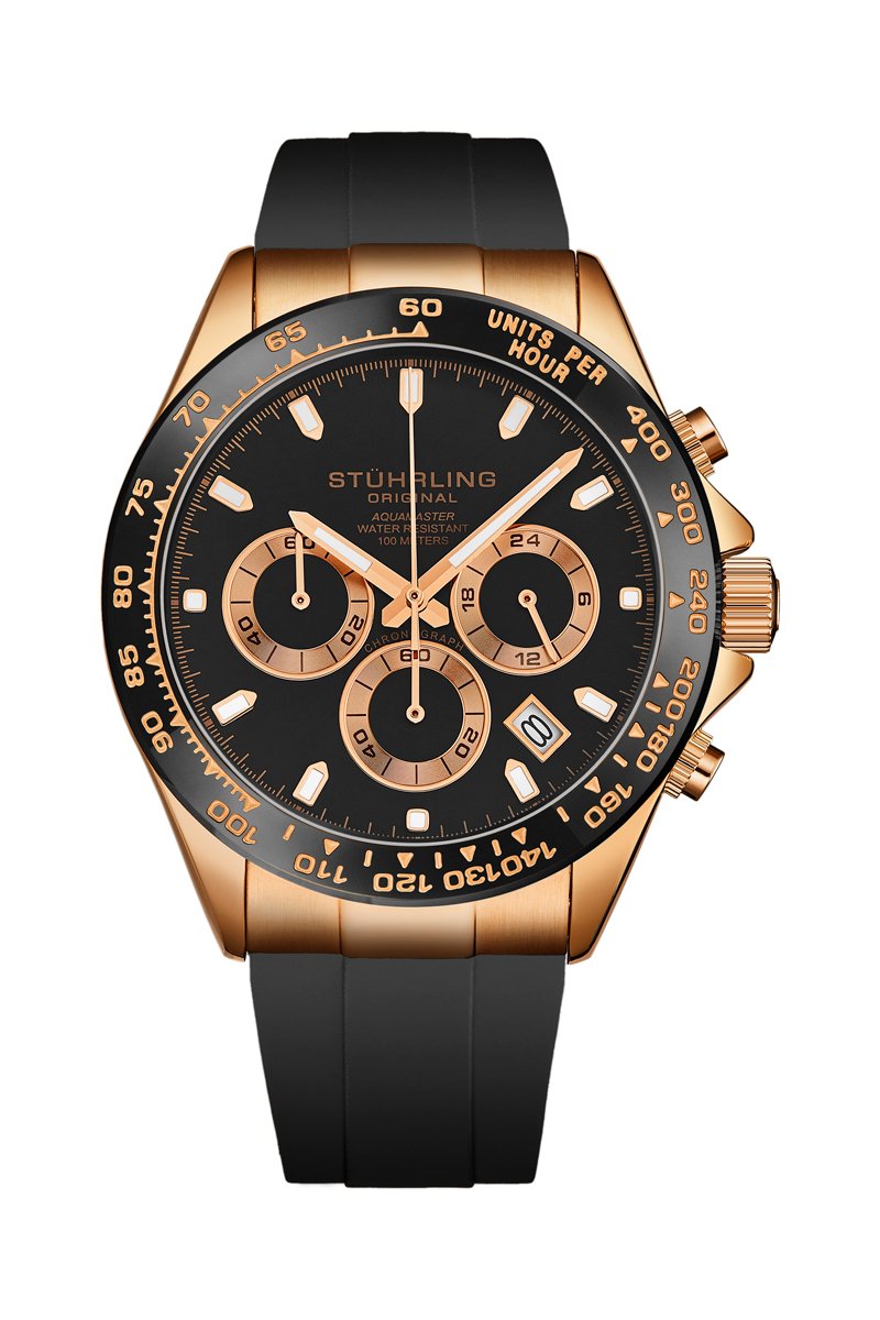 Montre à quartz en caoutchouc - Chronographe et tachymètre - Noir et doré rose