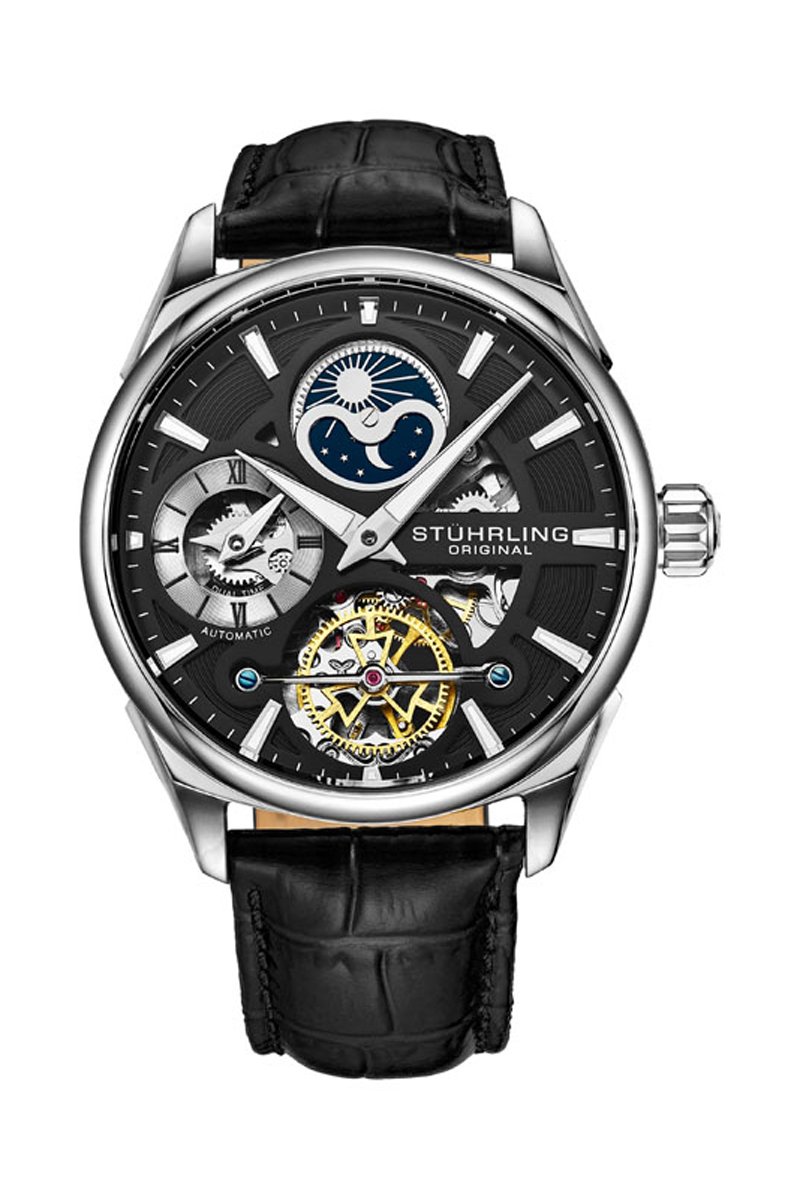 Montre automatique en cuir Legacy - Indicateurs des phases de la lune et fonction GMT - Noir et argenté