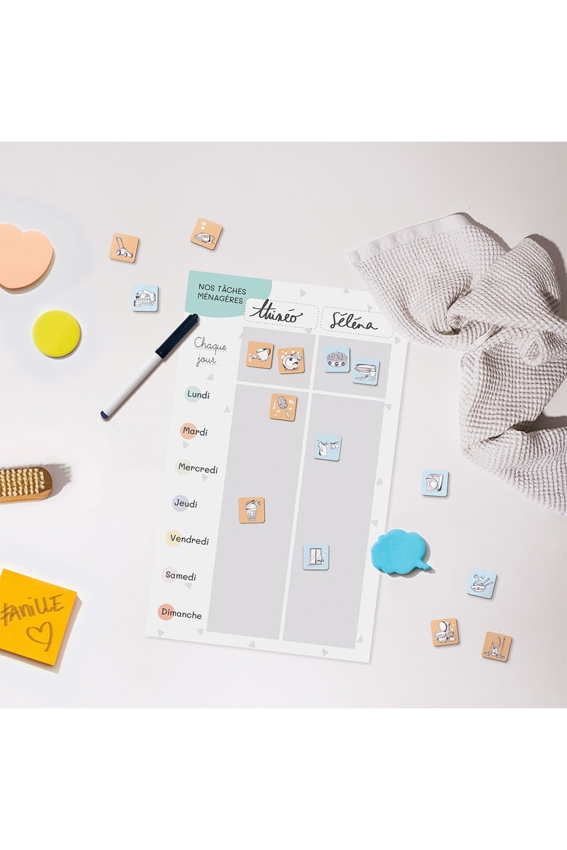 Livré avec un tableau magnétique, 1 marqueur effaçable, 16 magnets verts et 16 magnets violets.