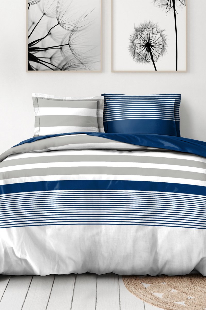 Parure de couette en percale de coton 80 fils/cm² La Courtisane - Bleu marine et gris