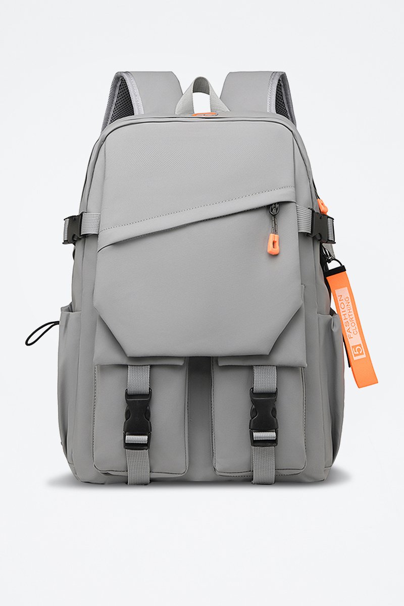 Poche avec liens de serrage, barillet et sangle réglable avec fermeture par clip sur les côtés.